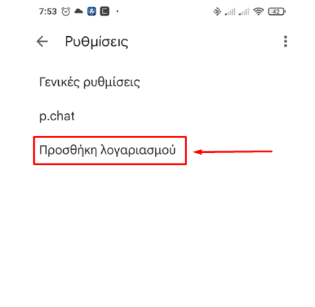 Ανοίγουμε την προεγκατεστημένη εφαρμογή του Gmail και πηγαίνουμε στις ρυθμίσεις. Επιλέγουμε Προσθήκη λογαριασμού.