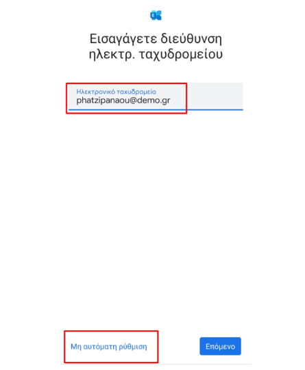 Καταχωρούμε το εταιρικό μας mail (είναι ο ίδιος κωδικός με τον κωδικό των Windows) και πατάμε “Μη αυτόματη ρύθμιση”.