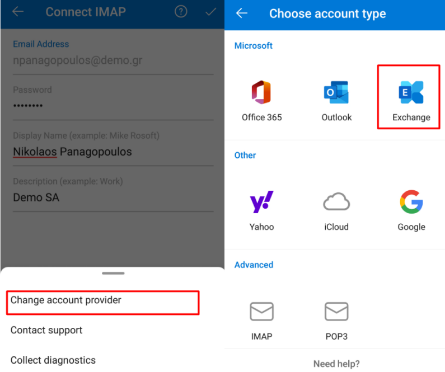 Πατάμε το εικονίδιο του ερωτηματικού πάνω δεξιά και επιλέγουμε ‘change account provider’. Στη συνέχεια επιλέγουμε Exchange.