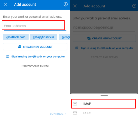 Στη συνέχεια συμπληρώνουμε το εταιρικό μας email και πατάμε continue. Εκεί θα μας ζητήσει με ποιόν τρόπο θέλουμε να συνδεθούμε και επιλέγουμε IMAP.