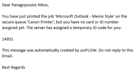Αυτές μπορούμε να τις λάβουμε από οποιοδήποτε εκτυπωτικό μηχάνημα είτε με την κάρτα μας είτε με κωδικό πρόσβαση (TIC). Για να αποκτήσουμε κωδικό πρόσβαση δεν χρειάζεται κάτι παραπάνω από το να στείλουμε την πρώτη εκτύπωση. Τότε θα λάβουμε αυτοματοποιημένα ένα email της παρακάτω μορφής με τον καινούργιο κωδικό.