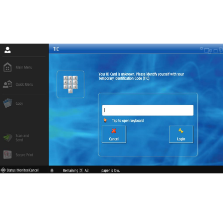 Για να χρησιμοποιήσουμε κάρτα αντί για κωδικό, θα πρέπει να έχουμε λάβει πρώτα από το HR την μόνιμη κάρτα εργαζομένου. Για να την ενεργοποιήσουμε την χτυπάμε σε κάποιο εκτυπωτικό μηχάνημα και μας εμφανίζει το παρακάτω μήνυμα.